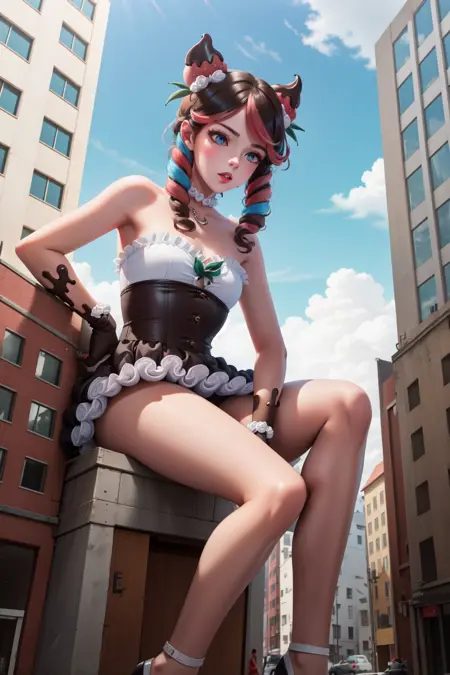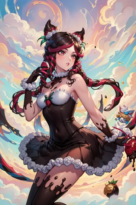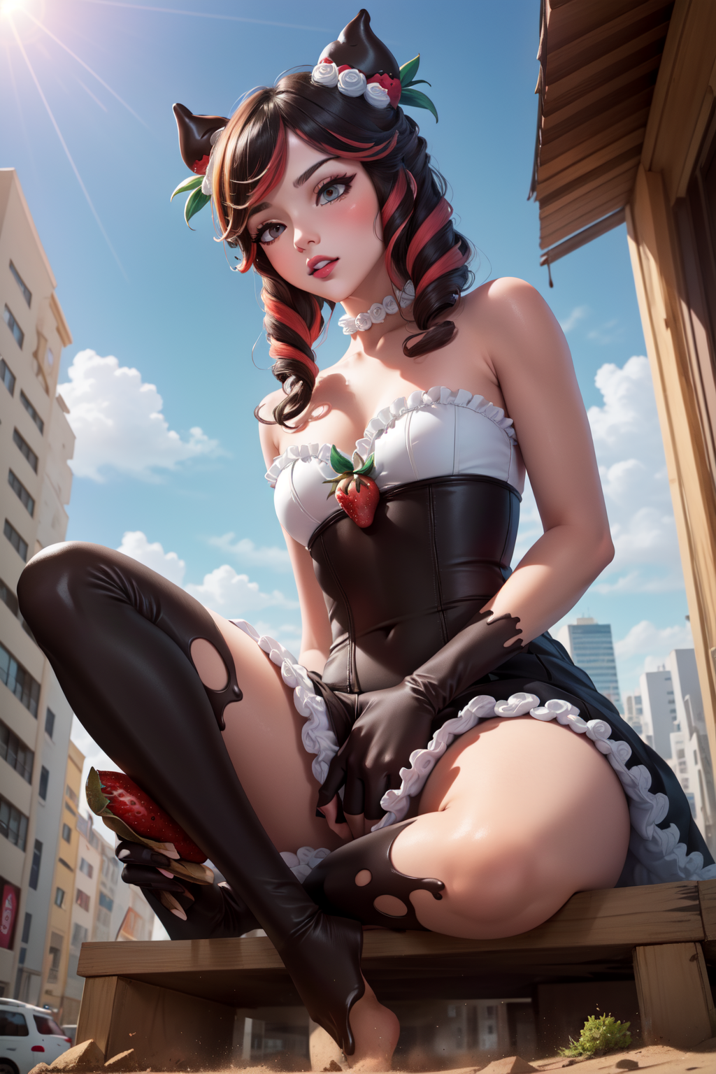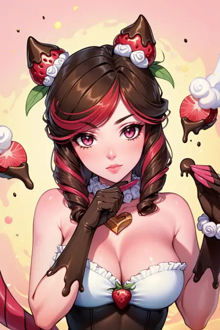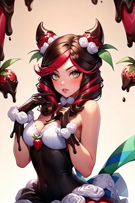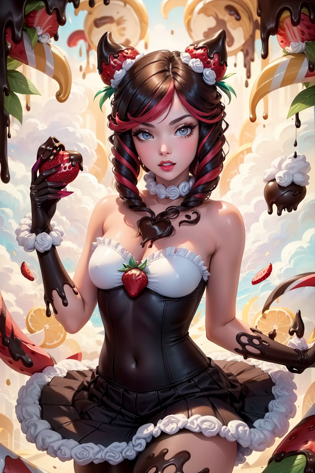 标签:sugar rush evelynn, 1girl, 无肩带连衣裙, 手套, 身体上的巧克力, 草莓发饰, 多彩发色