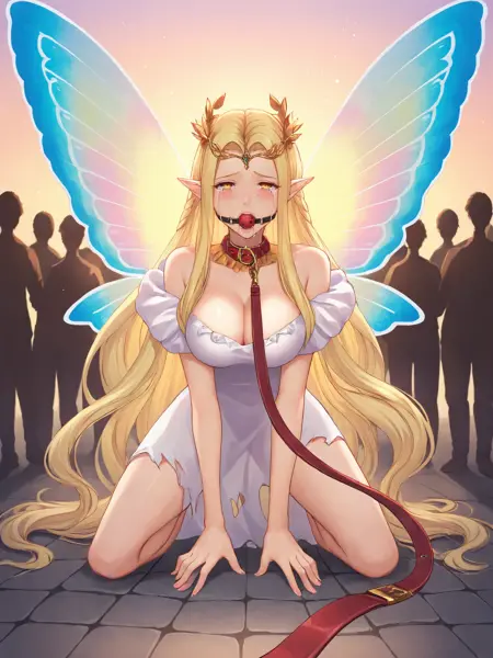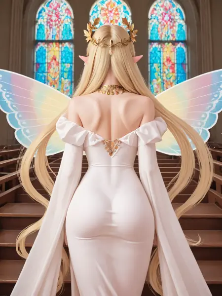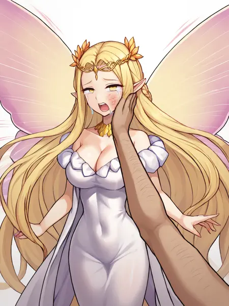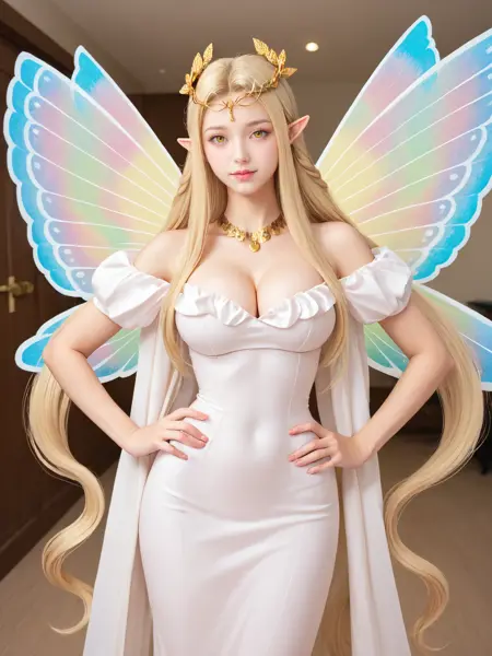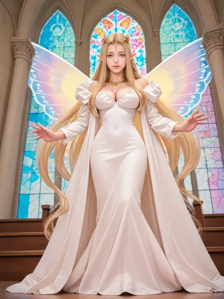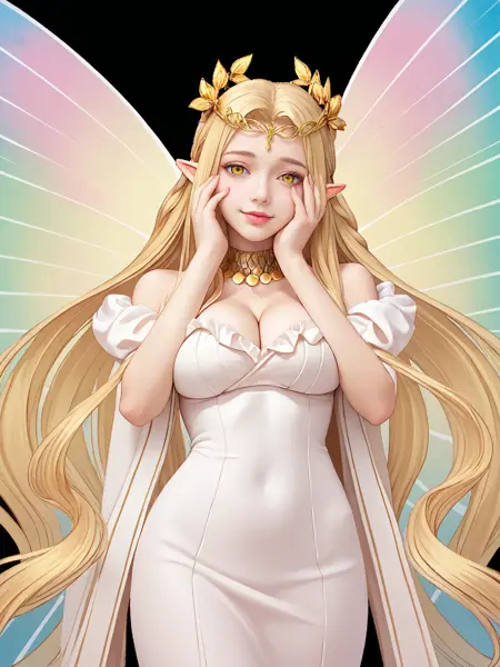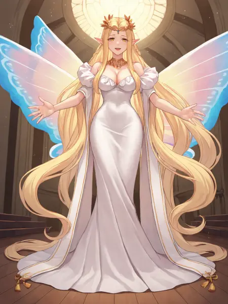 aurorafategrandorder, fairy, blonde hair, parted bangs, wavy hair, absurdly long hair, yellow eyes, pointy ears, circlet, forehead, jewelry, necklace, large breasts, cleavage, white dress, long dress, off-shoulder dress, mermaid dress, tight clothes, tight dress, narrow waist, stole, tassel, bare shoulders, collarbone, butterfly wings, insect wings, fairy wings, multiple wings,