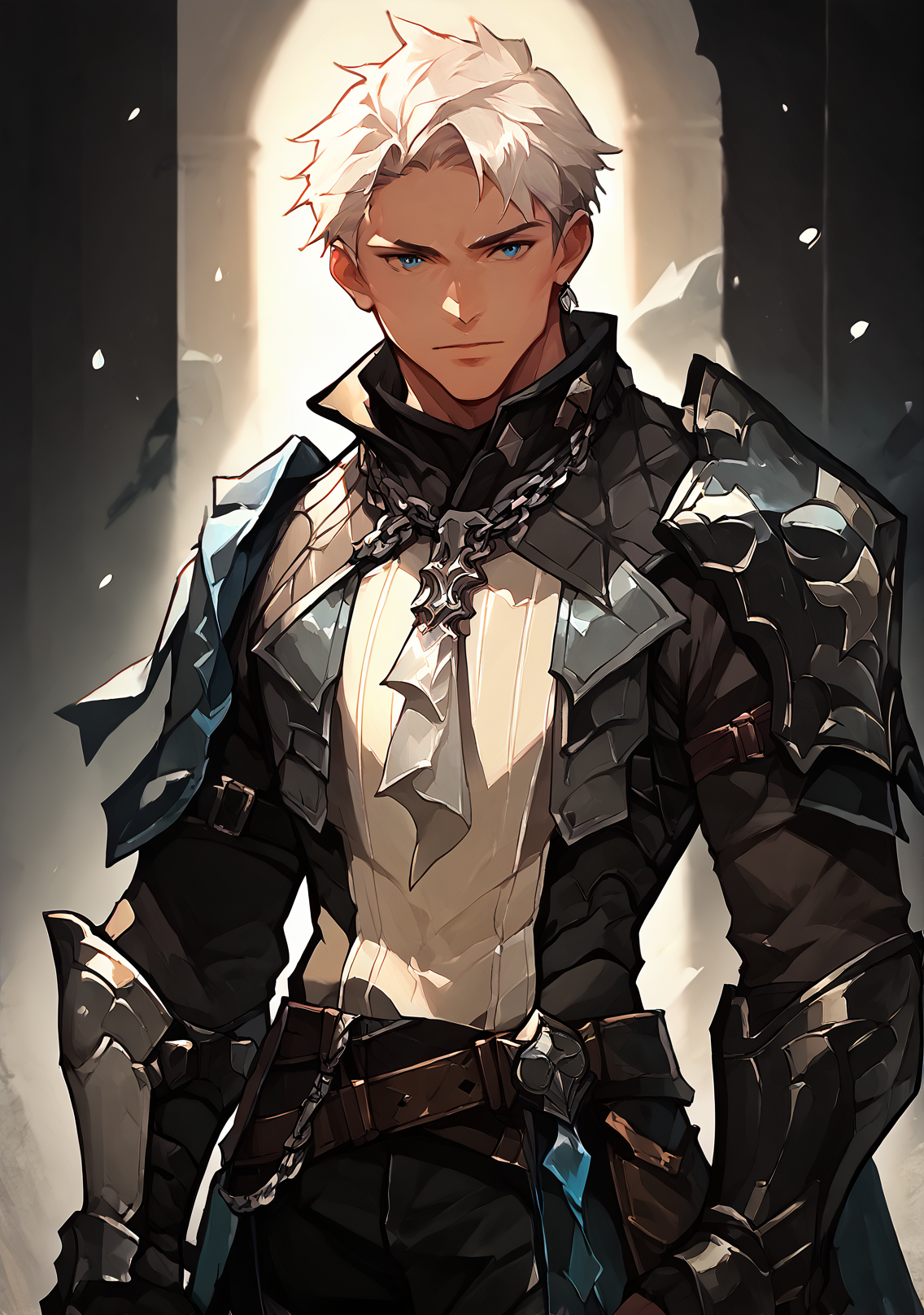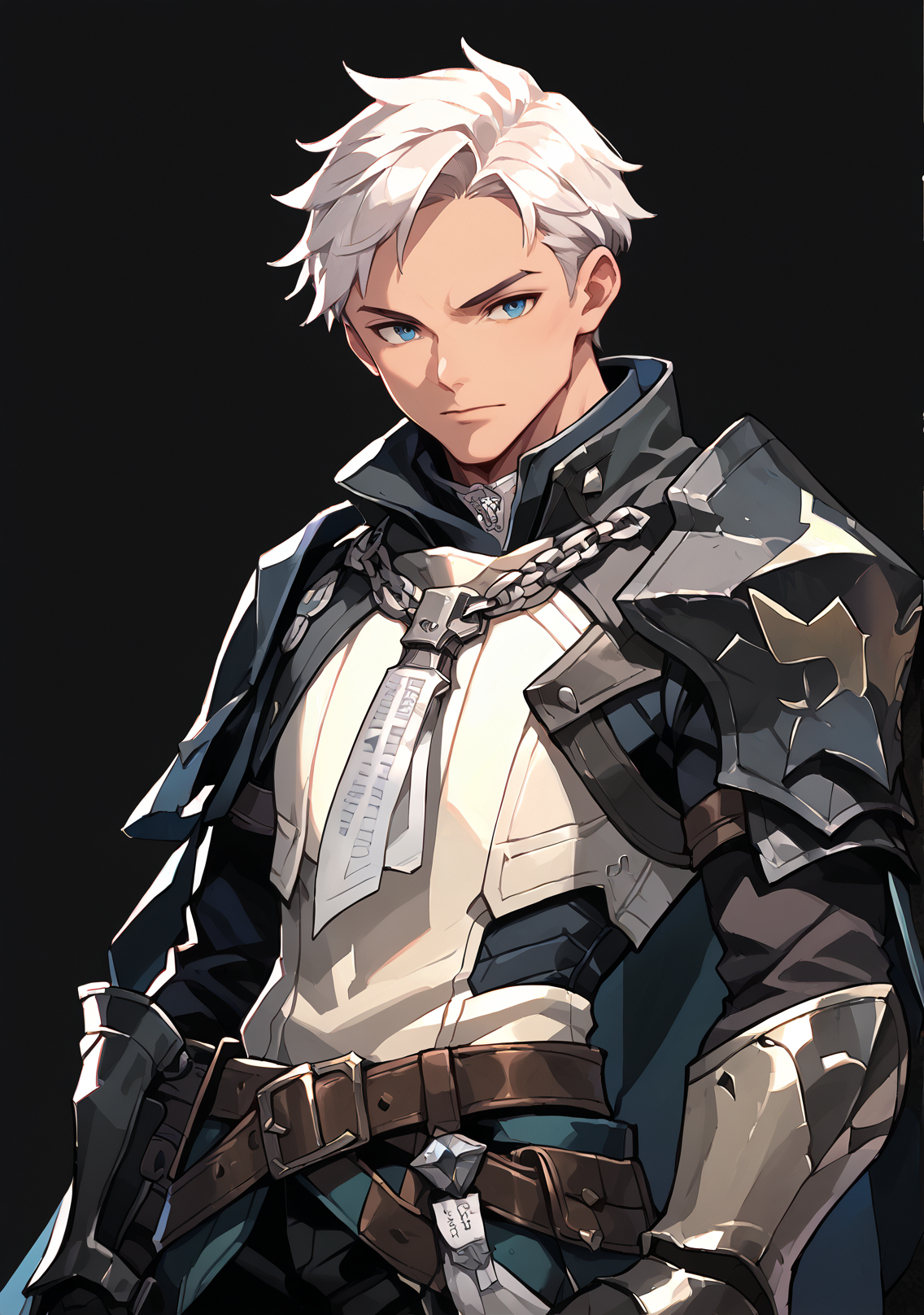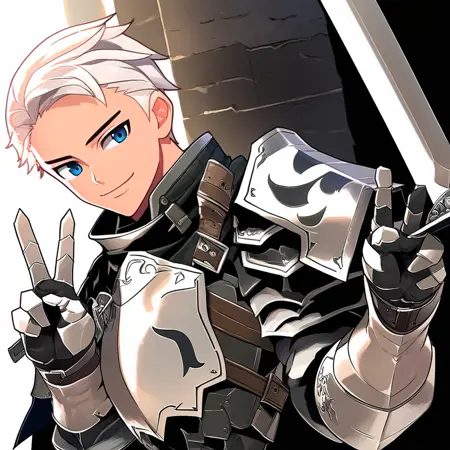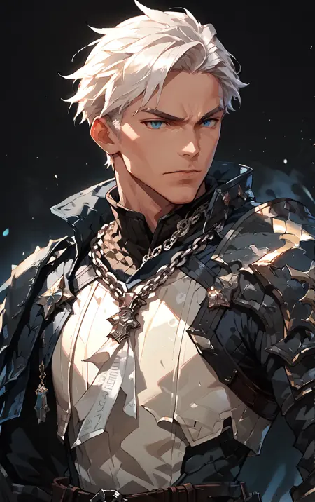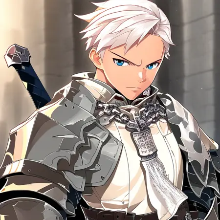 トリガー語(オプション):白髪、短髪、サイドパート、青い目、鎧、鋼製の肩当て、白いチュニック、紙が付いたチェーンネックレス、肌が白い、鋼製の手甲、茶色のベルト、背中に剣、高めのカラー