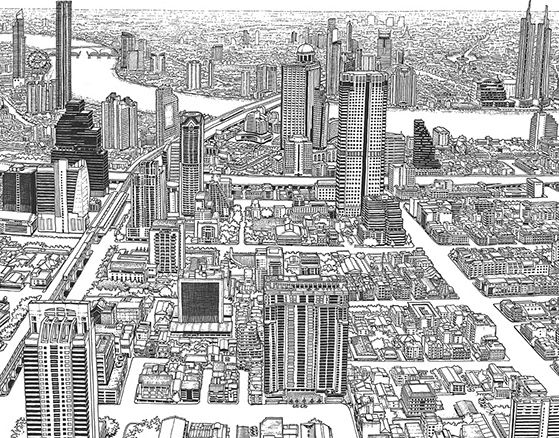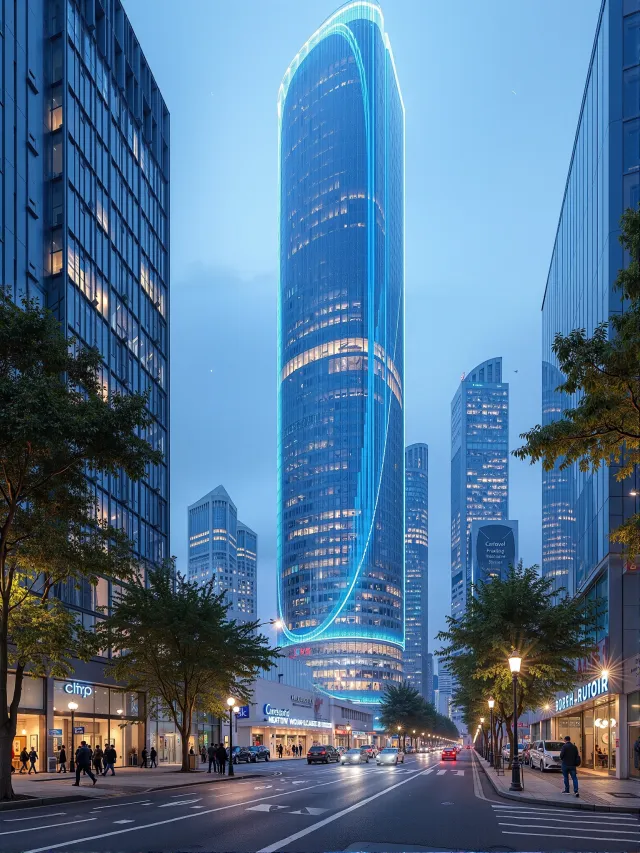 황혼 시각의 현대식 고층 건물의 사진. 이 건물은 여러 층과 발코니로 이루어져 있으며, 따뜻한 조명이 건물의 건축적 디자인을 부각시킨다. 건물 주변은 풍성한 녹색 나무들과 정성스럽게 관리된 잔디로 둘러싸여 평온한 분위기를 연출한다. 하늘은 밤으로 변해가며, 건물의 조명된 특징을 강조하는 배경을 제공한다. 포장된 산책로가 입구로 이어져 방문객들의 접근성을 시사한다.
