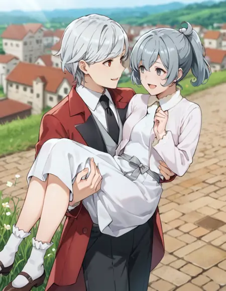 date outfit, red tailcoat, black necktie, white shirt, collared shirt, grey vest, long sleeves, white gloves, black pants, brown shoes