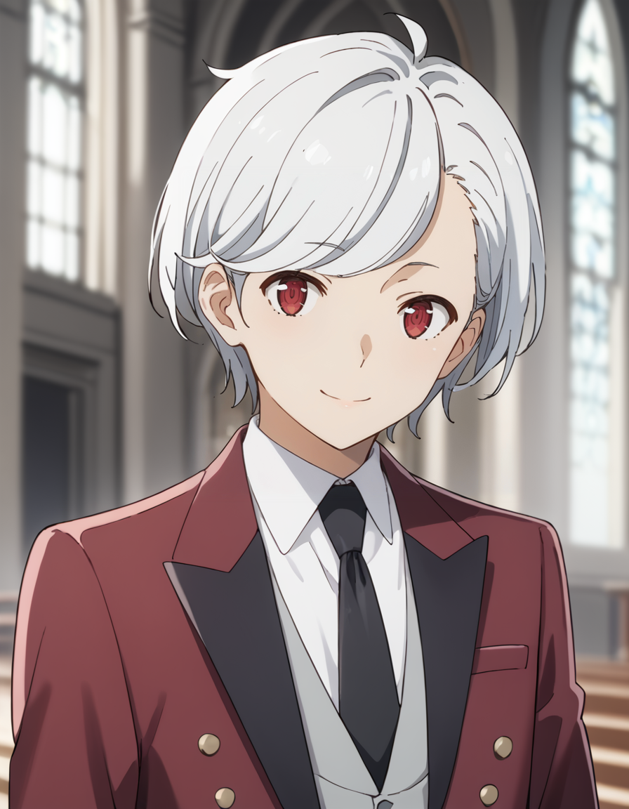 bell cranel, short hair, white hair, side-swept hair, red eyes