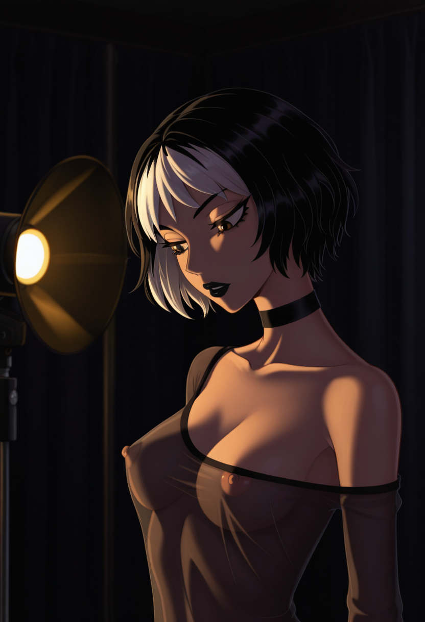 sh4mts4r, brown eyes, jewelry, hat, veil, purple dress, long sleeves, gloves, belt,