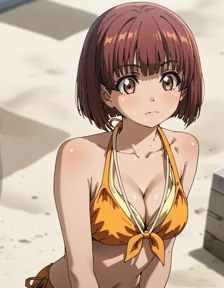 akari, swimsuit, bikini, short hair, brown eyes, cleavage, brown hair, bangs, orange bikini, collarbone, bob cut,