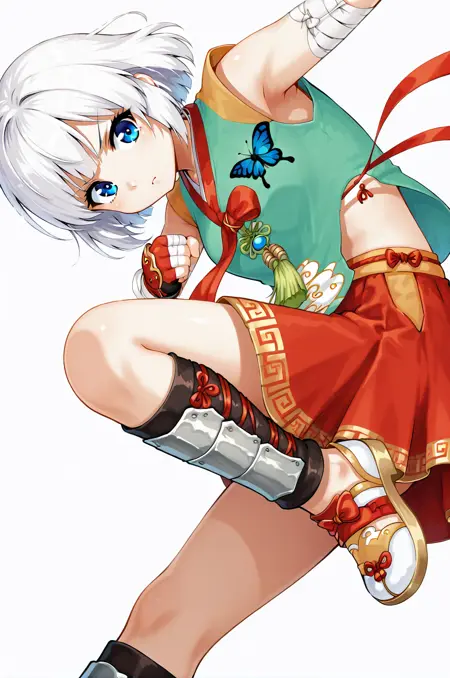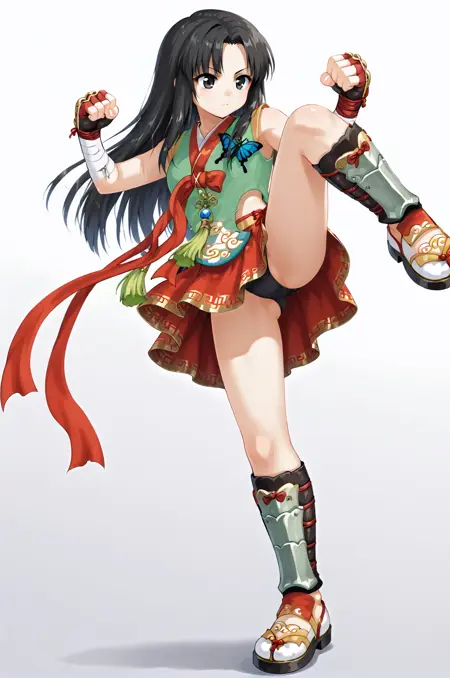 prompt: taekRo, fingerless gloves, bandaged arm, sleeveless, pleated skirt, red skirt, red sash, butterfly print, ribbon, red bow, green tassel, side cutout, blue shirt, wrist wrap, shoes, shin guards