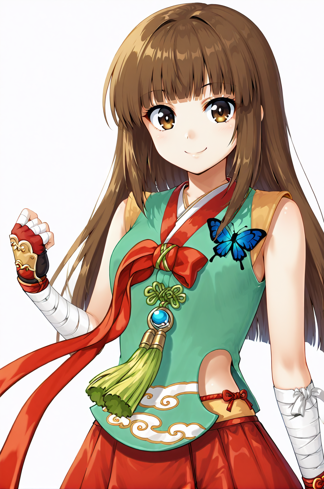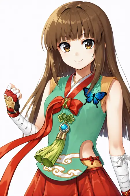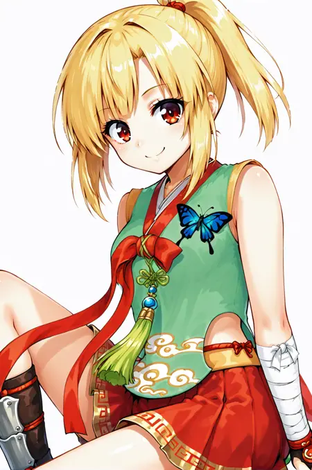 prompt: taekRo, fingerless gloves, red skirt, green shirt, sleeveless, bandaged arm, tassel, butterfly print