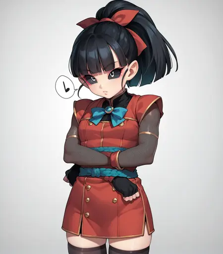 black hair, black eyes, ponytail, blunt bangs, red ribbon in hair, red fingerless gloves, black thighhighs,