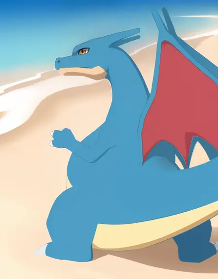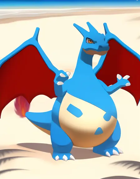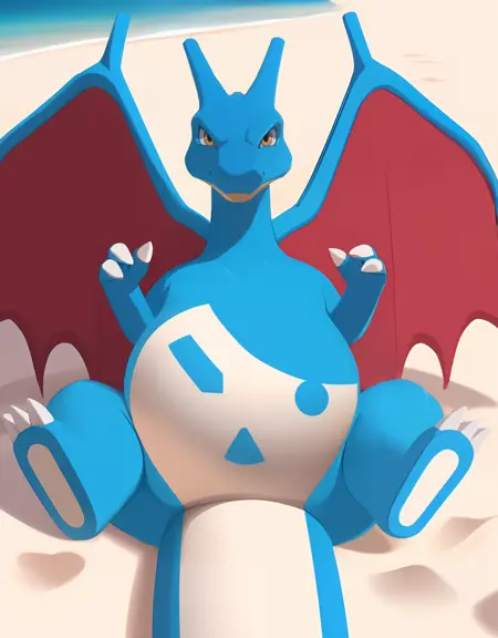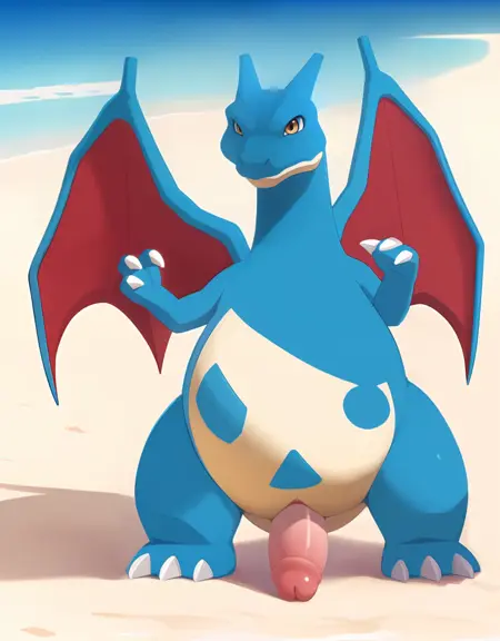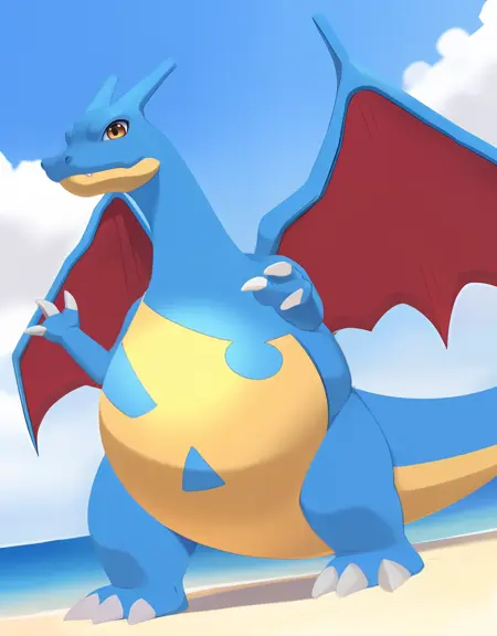 Related words : blue skin, yellow eyes, orange eyes, brown eyes, bright pupils, white pupils, tusks, fangs, fangs out, fang out, claws, dragon boy, dragon tail, flame-tipped tail, fire, flame, spread wings, dragon wings, green wings, red wings, no humans, monster boy, pokemon (creature), shiny pokemon