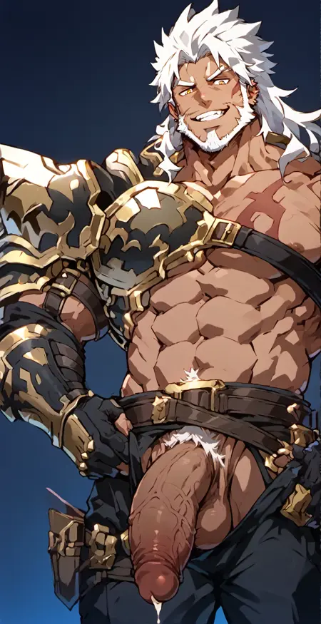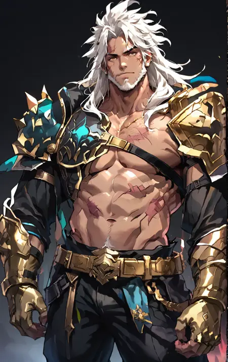 Trigger word (optional): mature, bara, single gold and black pauldron, gold and black chest strap, short white beard, long spiky white hair, tanned skin, muscular, bare chest, abs, pectorals, gold belt, black pants, heavily built, gold and black gauntlets, upper arm belt straps, scarred chest,