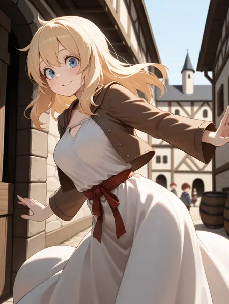 Lucifina, blonde hair, long hair, blue eyes, medium breasts,smile, parted lips, medieval clothes, dress, villager girl, jacket,