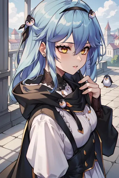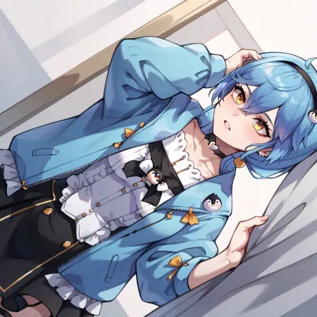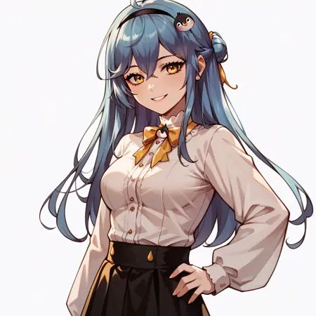 Aruzeya, 1girl, long hair, breasts, bangs, skirt, hair ornament, hair between eyes, brown eyes, medium breasts, blue hair, yellow eyes, ahoge, hairband, black hairband, penguin hair ornament,