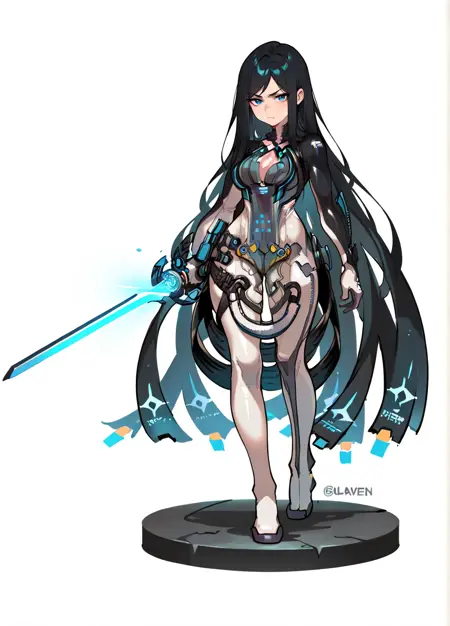 Recommended weight: 0.8. Here's your daily dose of evil woman, brought to you thanks to the photo mode. The character has a mole under the right eye, I don't recommend prompting for it since it might mirror to both sides. For the glowing thingies in the bodysuit just go for "science fiction".