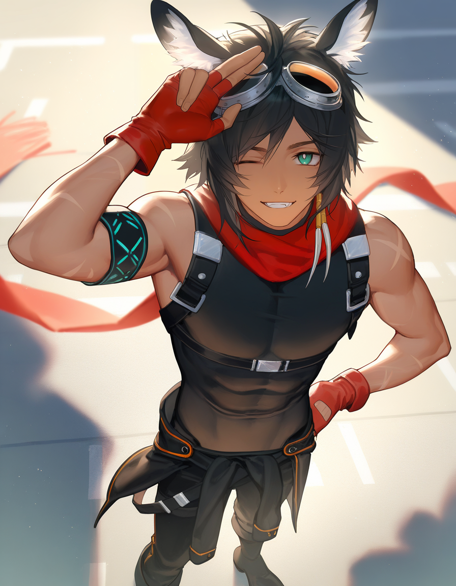 1boy, courier \(arknights\), courierarknights, 근육질 남성, 사슴耳朵, 동물 귀 털, 중간 길이 머리, 청록색 눈, 밝은 동공, 황갈색 피부,