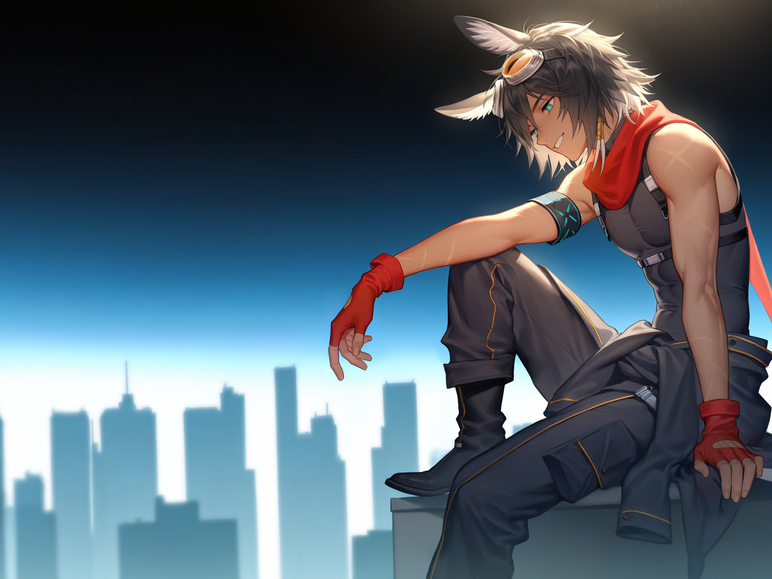 빨간 스카프, 팔밴드, 머리에 안경, 이빨 장식 헤어 액세서리, 주황색 안경, 용접 안경, 빨간 장갑, 손가락 없는 장갑, 검은 민소매 바디수트, 가슴 하네스, 허리에 둘러쓴 검은 재킷, 검은 바지,