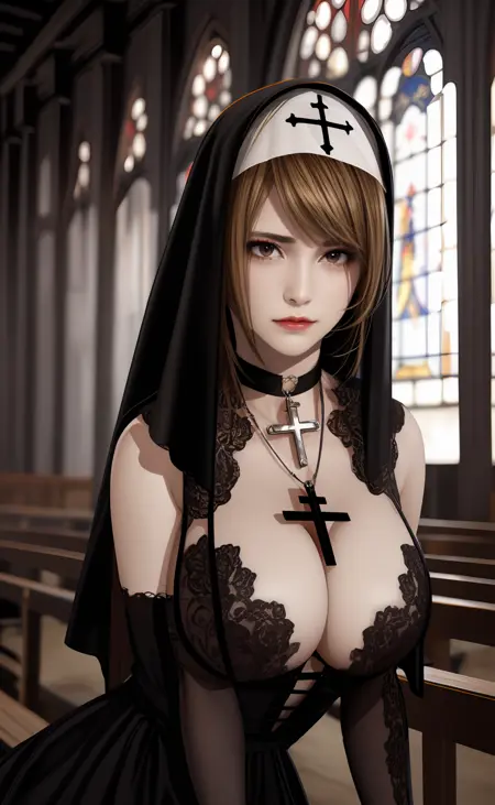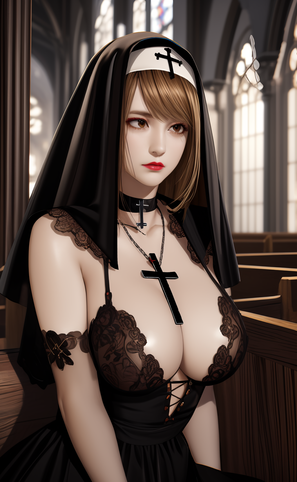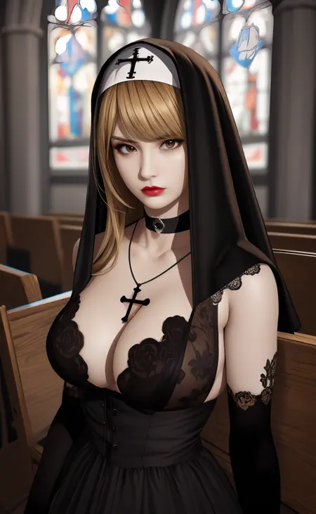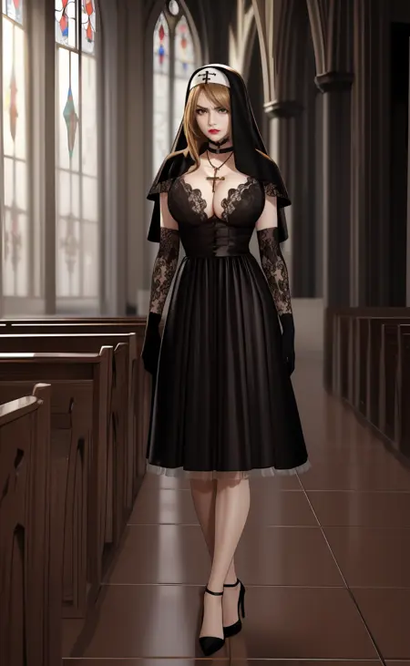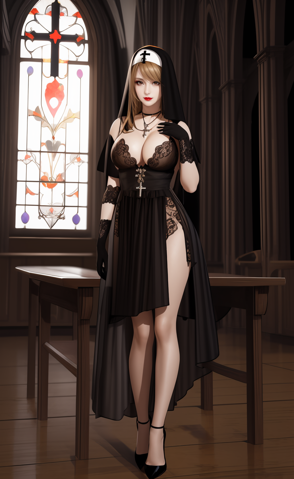 nun,veil,dress,black dress,gloves,elbow gloves,black gloves,cross,necklace,jewelry,choker,cleavage,see-through,black footwear,high heels