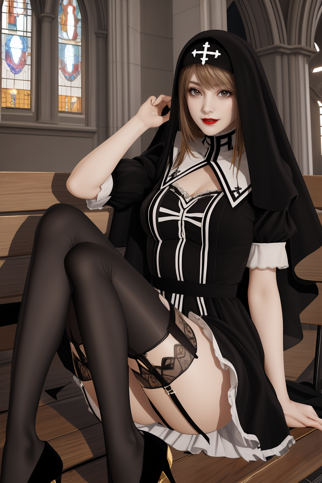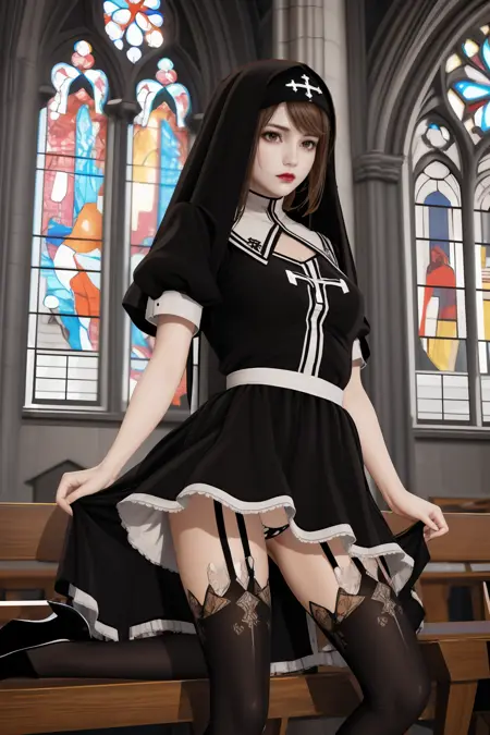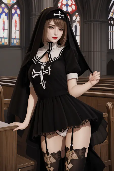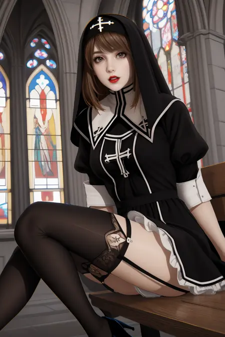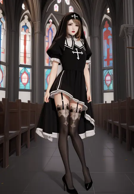 | 训练词汇 | ai girl012 v2,1girl,brown hai,bangsr,brown eyes,red lips,medium breasts已复制! nun,veil,cross,habit,dress,black dress,puffy sleeves,short sleeves,underwear,panties,garter belt,garter straps,black thighhighs,thighhighs,black footwear,high heels已复制! |