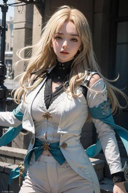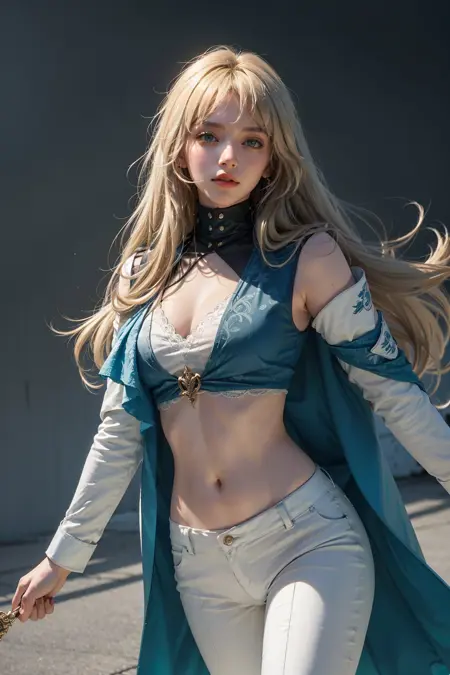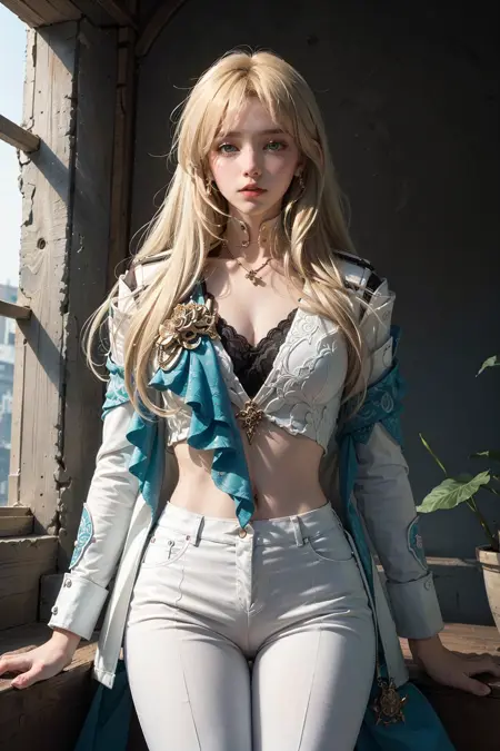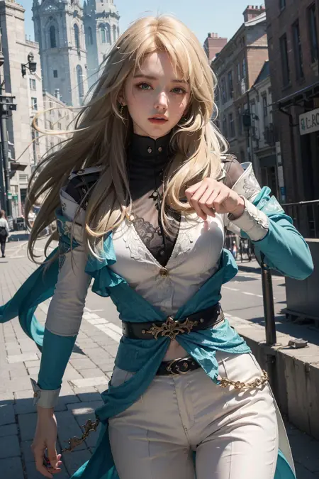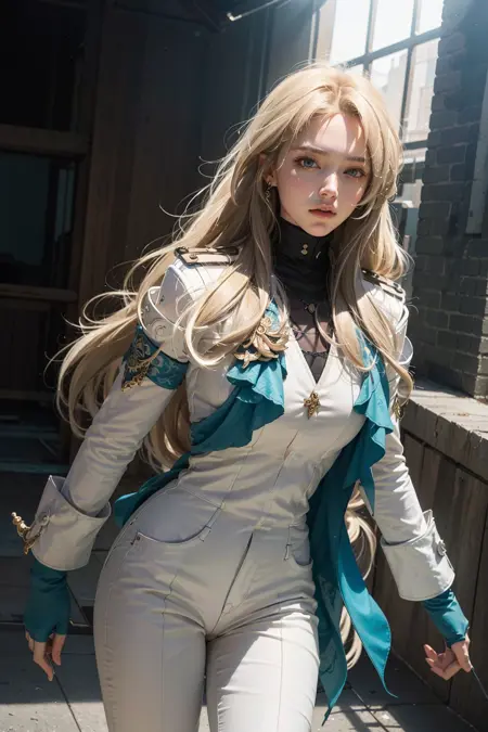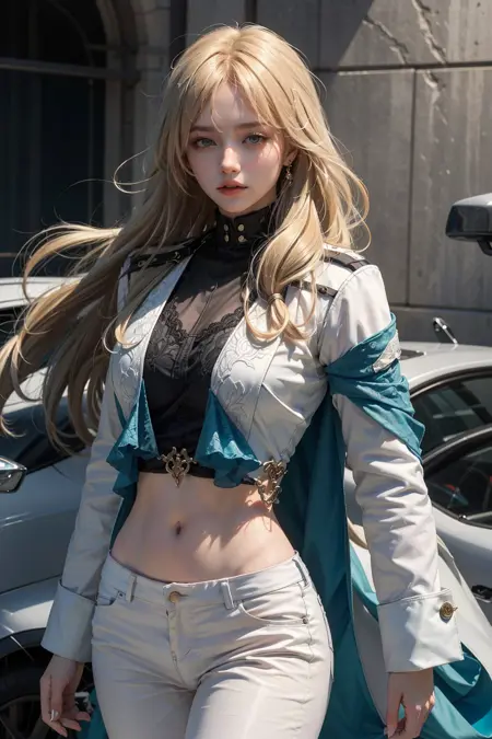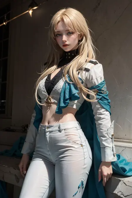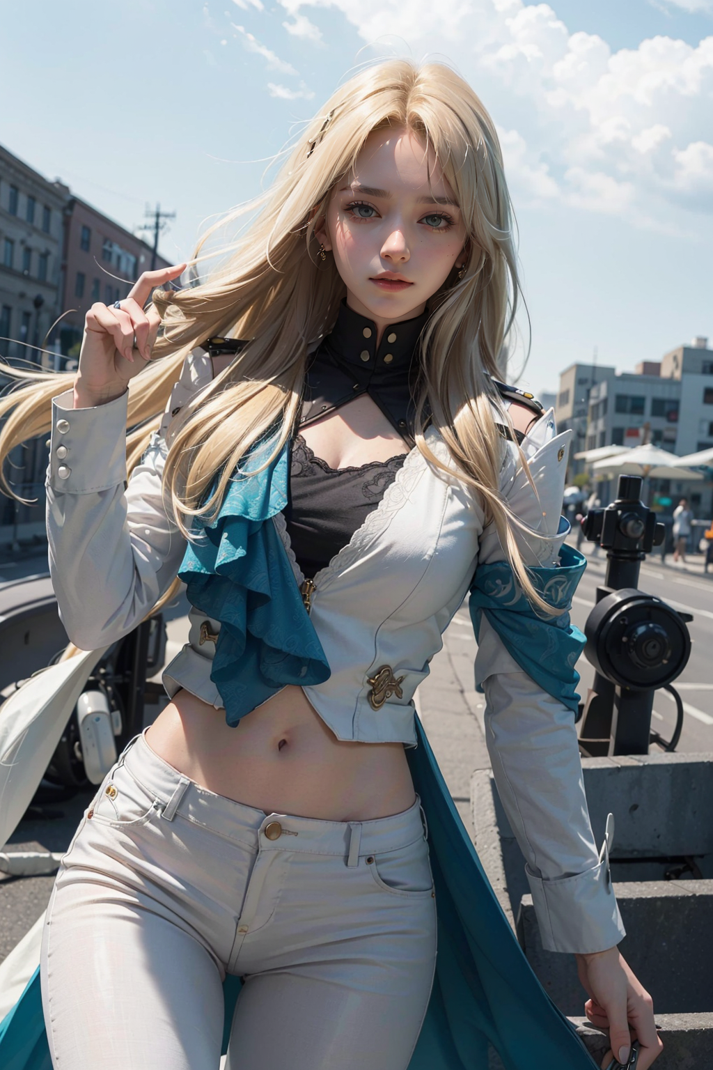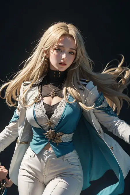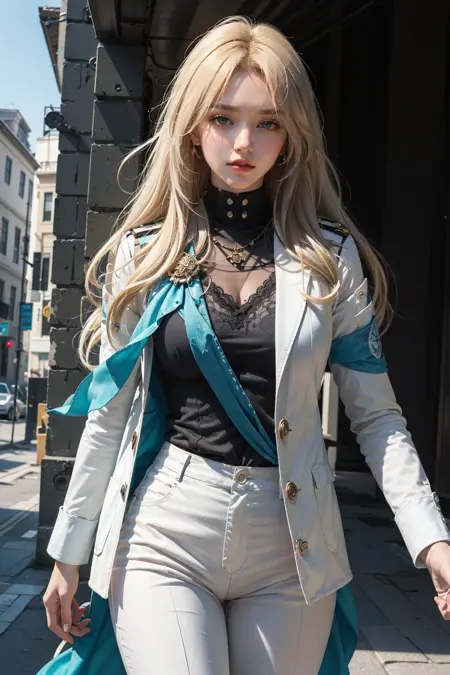 다음 트리거 단어를 사용하는 것을 권장합니다: 1girl, white coat, black shirt, white pants, blue ascot, blue armband, blue vest