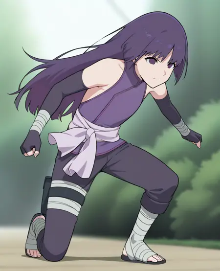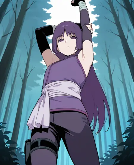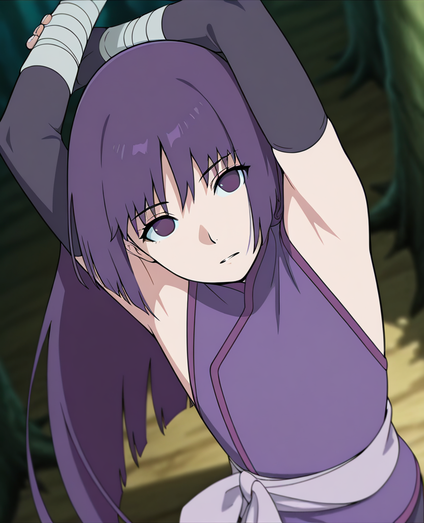 sm1, shirt, 1girl, long hair, bangs, elbow gloves, purple eyes, purple hair, no pupils, fingerless gloves, bandaged arm, jacket around waist, bandaged leg, thigh strap, pants