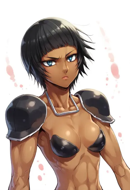 Tags > 1girl, warlady, black hair, short hair, pauldrons, bikini, dark skin, dark-skinned female