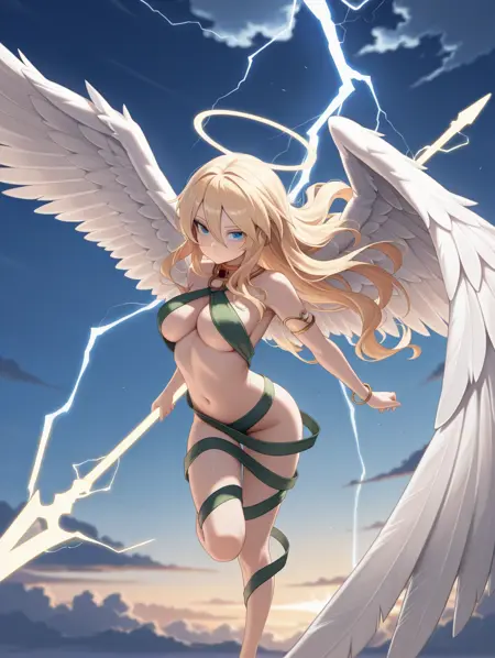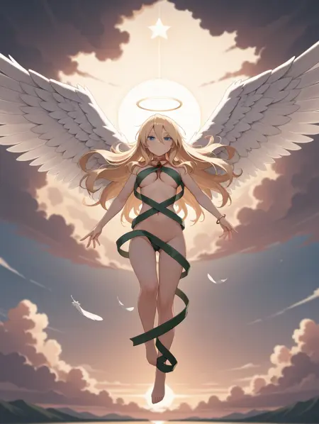米卡ela,金色头发,长发,尖耳朵,蓝眼睛,翅膀,天使翅膀,羽毛翅膀,天使,珠宝,下乳,光环,裸体丝带,丝带,
