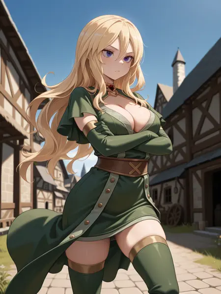 米卡ela,金色头发,长发,蓝眼睛,过膝长筒袜,手套,乳沟,肘部手套,绿色服装,绿色手套,绿色过膝长筒袜,