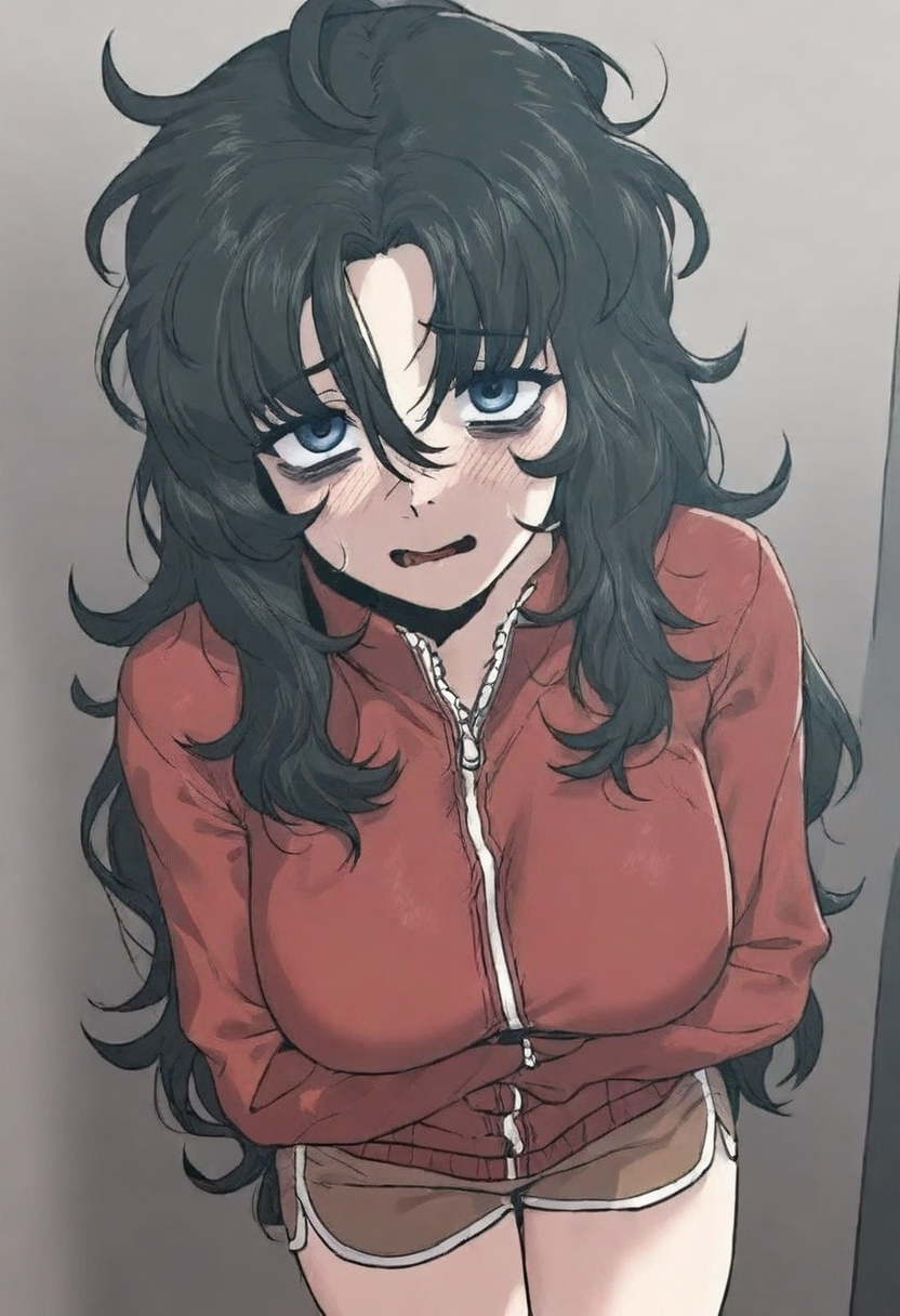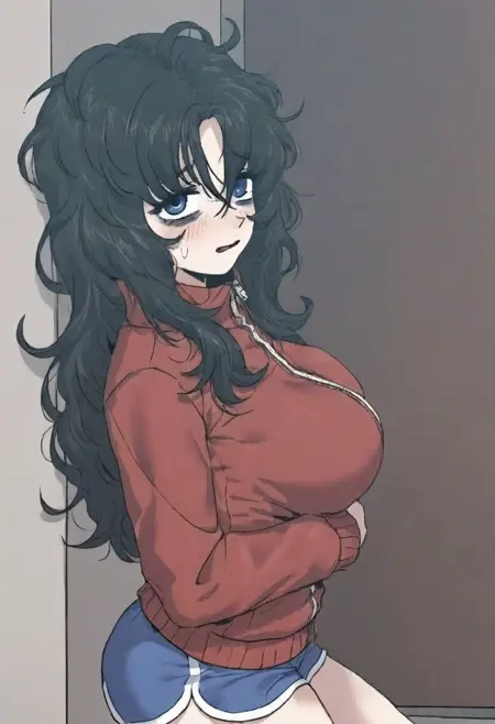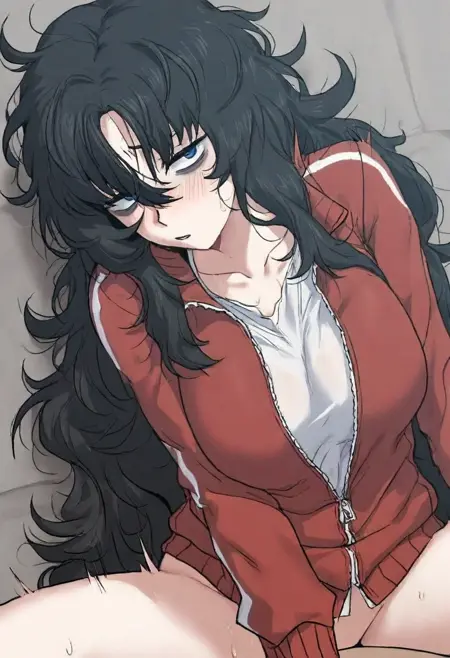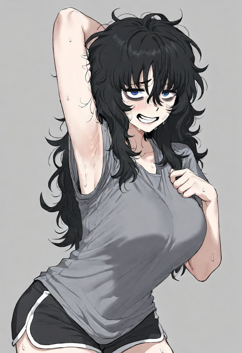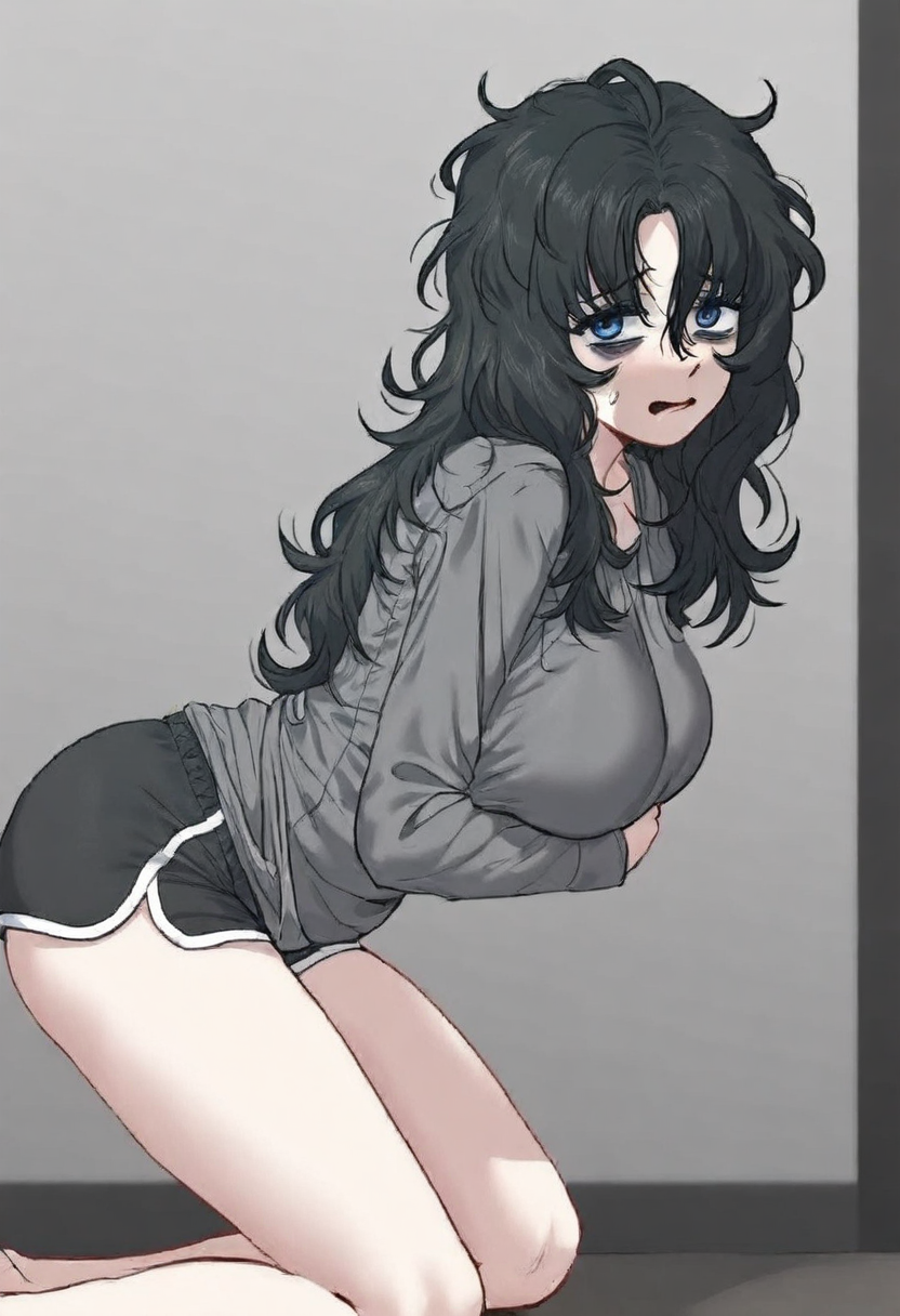 일반 프롬프트: 긴 머리, 검은 머리, 어수선한 머리, 가슴, 큰 가슴, 눈 밑 다크서클, 삼박, 파란 눈, 땀