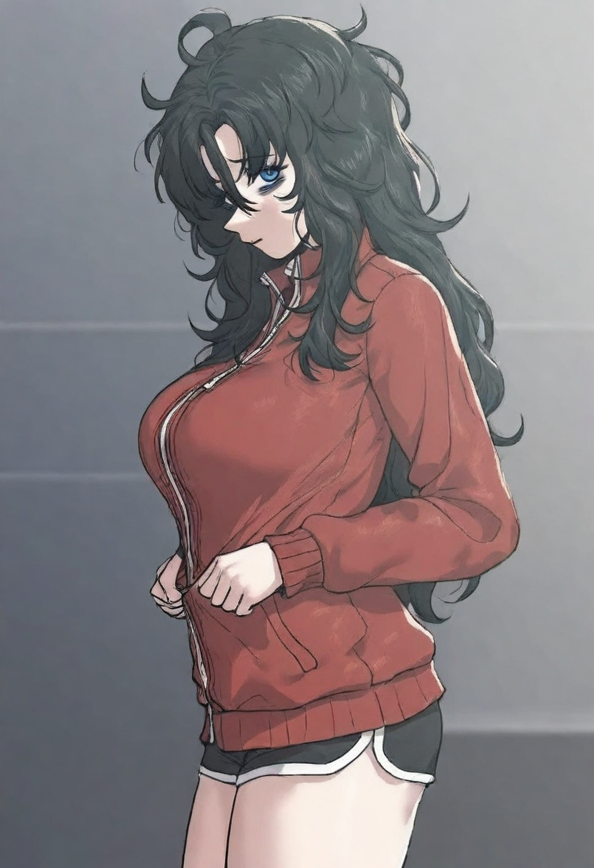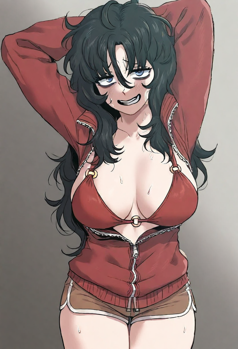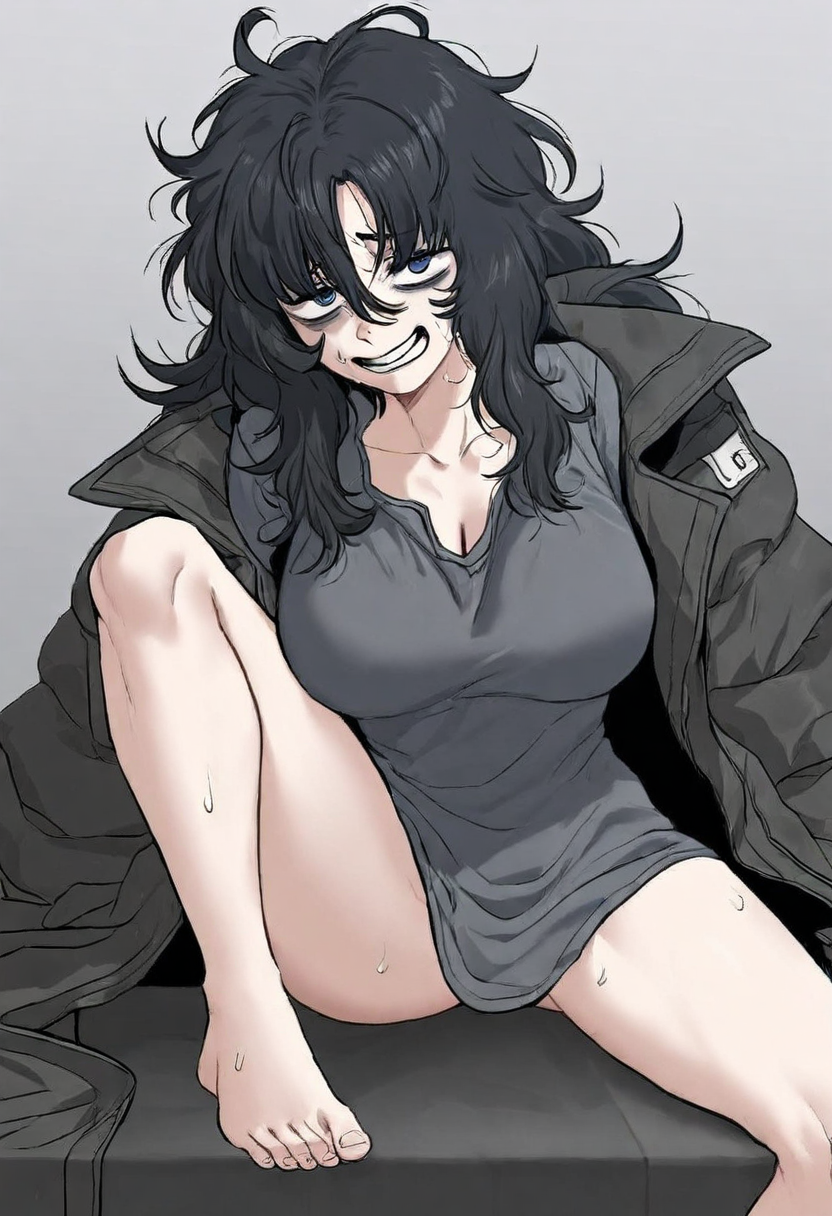 일반 프롬프트: 긴 머리, 검은 머리, 어수선한 머리, 가슴, 큰 가슴, 눈 밑 다크서클, 삼박, 파란 눈, 땀