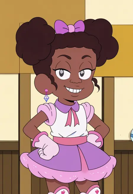 触发词:1girl,独奏,SparkleC_CotC,棕色皮肤,闪亮灰色眼睛,深棕色眉毛,深棕色头发,两个蓬松的侧发髻,热粉水晶耳环,浅粉色手套,粉色蝴蝶结,白色上衣配浅粉色卷起的袖子,热粉丝带领子,粉色裙子,热粉丝带,白色和粉色靴子