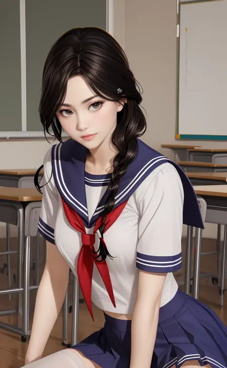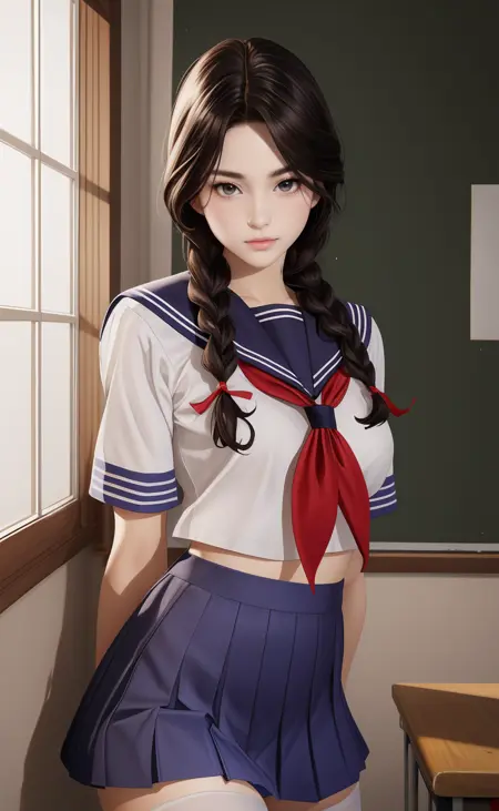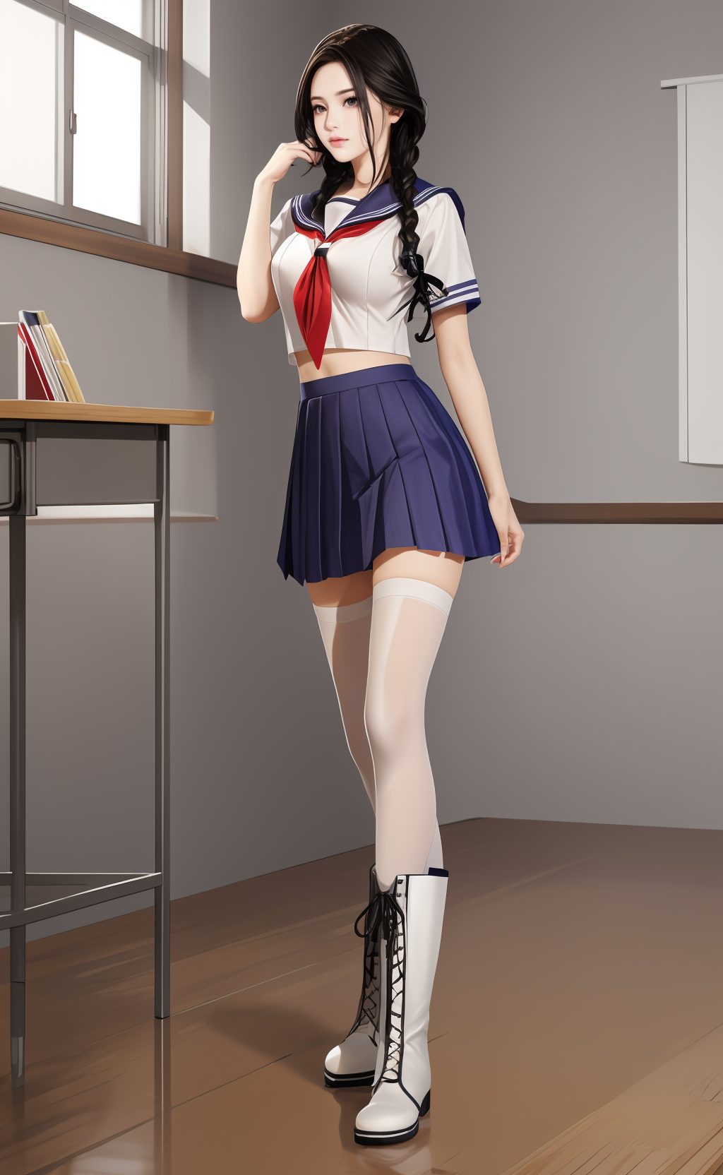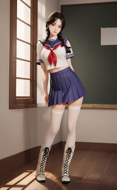| トレーニングワード | aigirl013v4,1girl,black hair,hair over shoulder,braid,twin braids,long hair,black eyes,medium breastsコピーしました! school uniform,serafuku,shirt,white shirt,sailor collar,red ribbon,short sleeves,skirt,blue skirt,pleated skirt,zettai ryouiki,thighhighs,white thighhighs,lace-up boots,cross-laced footwear,white footwear,bootsコピーしました! |