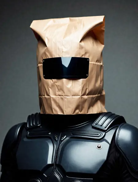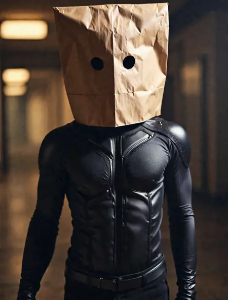 被写体の後、服や設定、場所の前に、\頭に紙袋を被っている``というプロンプトを追加してください。