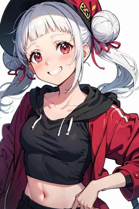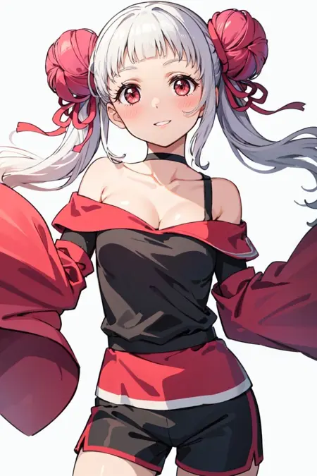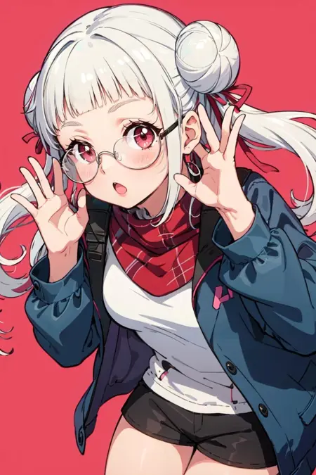 기본 시작 시 다음 태그를 사용하세요: pikkychisato, 1girl, solo, looking at viewer, white hair, hair bun, double bun, bangs, long hair, blunt bangs, twintails, short hair, red eyes, breasts, small breasts, jacket, blazer, yuigaoka school uniform, school uniform, blue jacket, dress, grey dress, brown footwear, shoes, ribbon, pinafore dress, open clothes, red ribbon, open jacket, loafers, neck ribbon