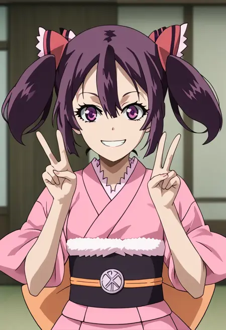 Irori, twintails, bow, hair bow, purple hair, purple eyes, hair between eyes,