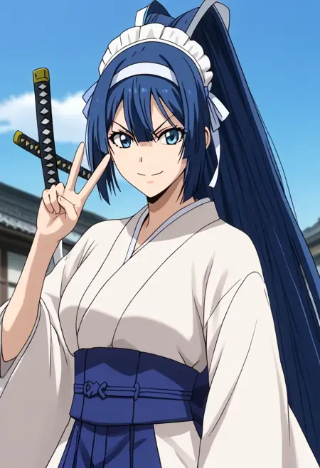 japanese clothes, maid headdress, weapon, sword, katana, blue hakama,