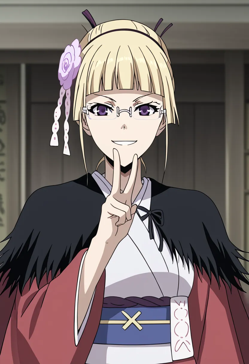 Mashiro, blonde hair, hair ornament, glasses, purple eyes, hair flower, bangs, blunt bangs, single hair bun, semi-rimless eyewear,