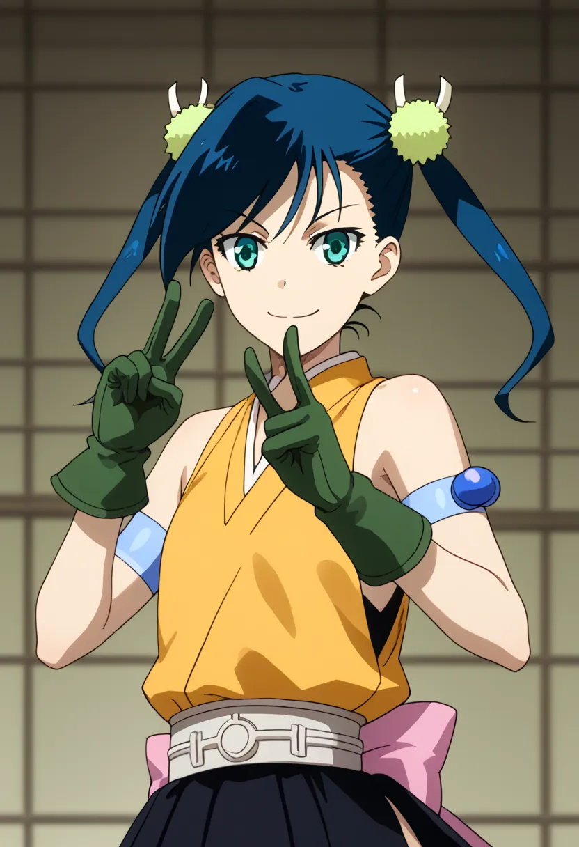 Hibachi, blue hair, twintails, short hair, green eyes,