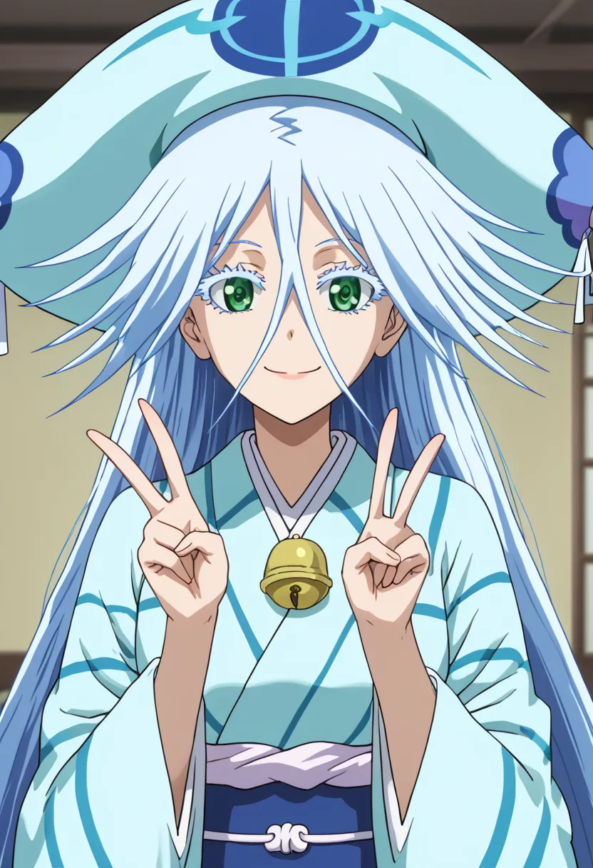 hat, kimono, japanese clothes, bell, striped kimono, blue kimono,