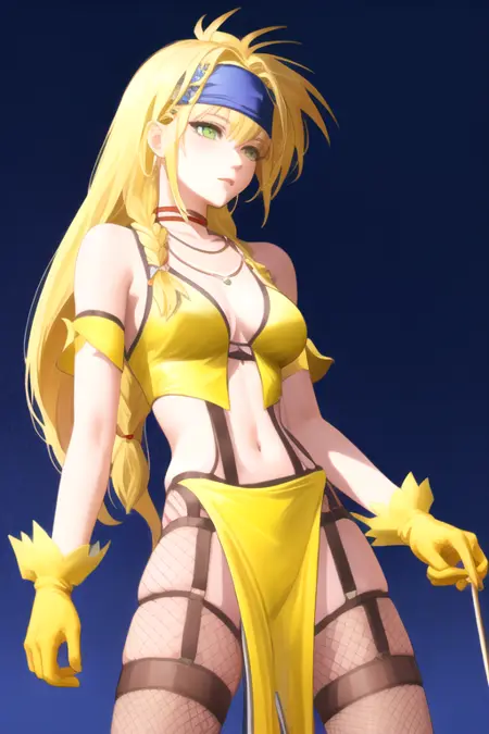 RikkuLadyLuck, 1girl, solo, long hair, blonde hair, hair ornament, thighhighs, gloves, navel, cleavage, medium breasts, green eyes, braid, blue headband, garter straps, garter belt, club (shape), midriff, necklace, fishnets, yellow clothes