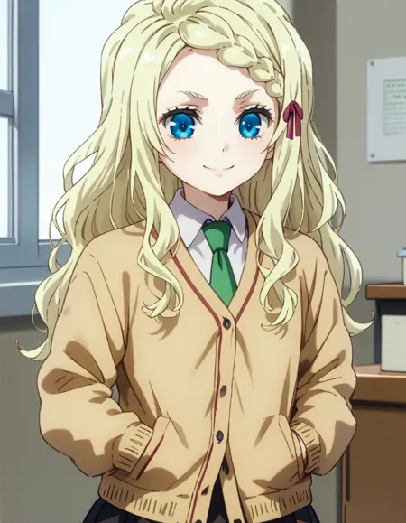 lucy, blonde hair, school uniform, necktie, blue eyes, long hair, skirt, braid, braided bangs, cardigan, white thighhighs,