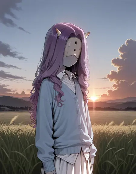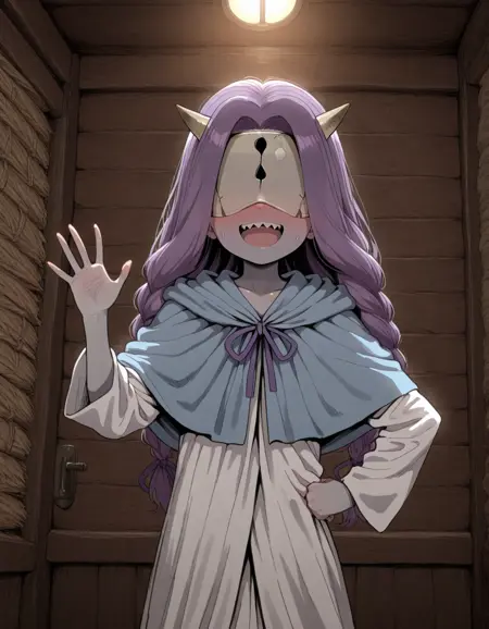 Mujika, solo, 1girl, purple hair, long hair, mask, small horns, grey skin, demon girl, no eyes