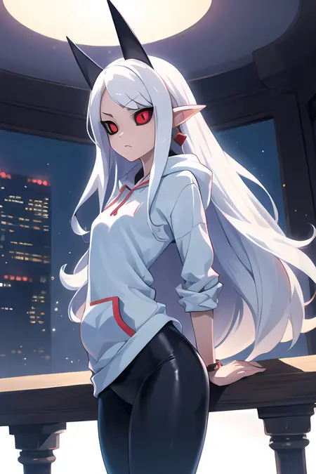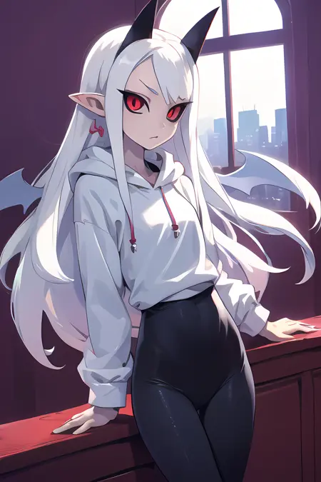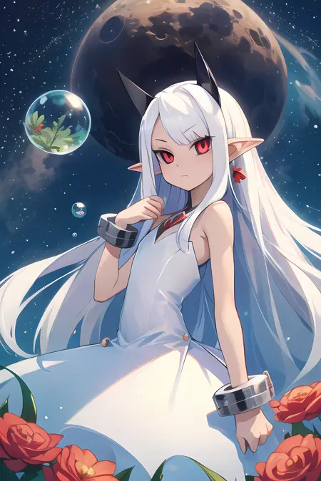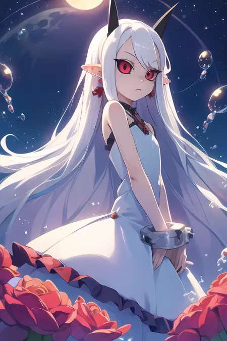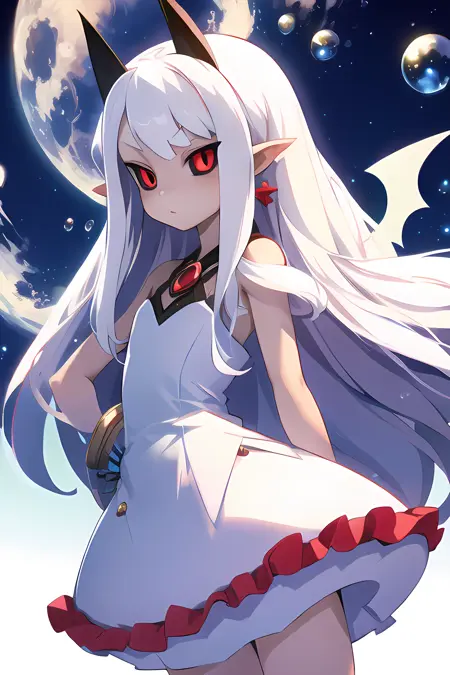使用するには、以下のすべてを推奨します: " pram_pk, horn, bat_wings, long_hair, white_hair, white_dress, bubble_skirt, cuffs, pointy_ears, black_sclera, red_eyes "