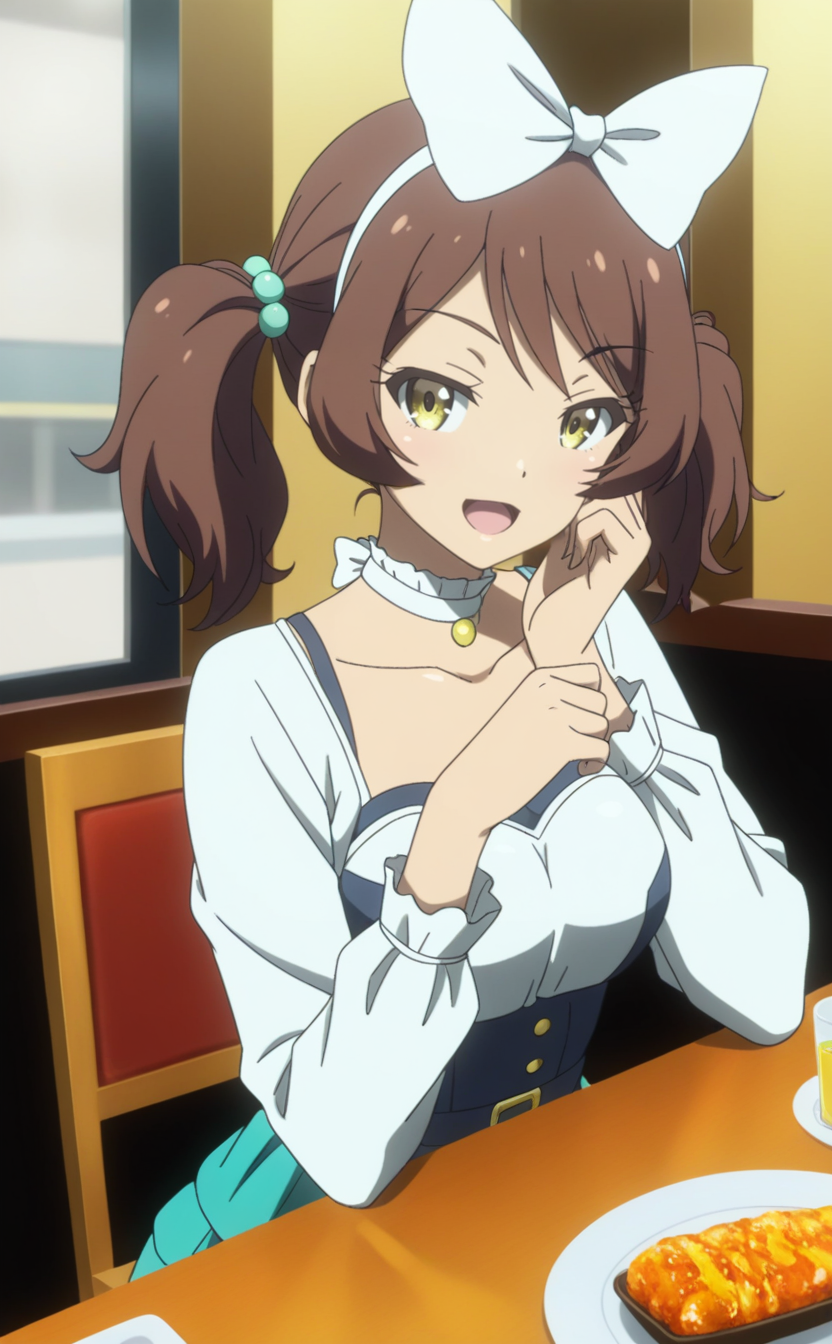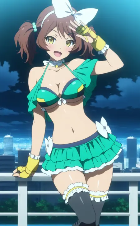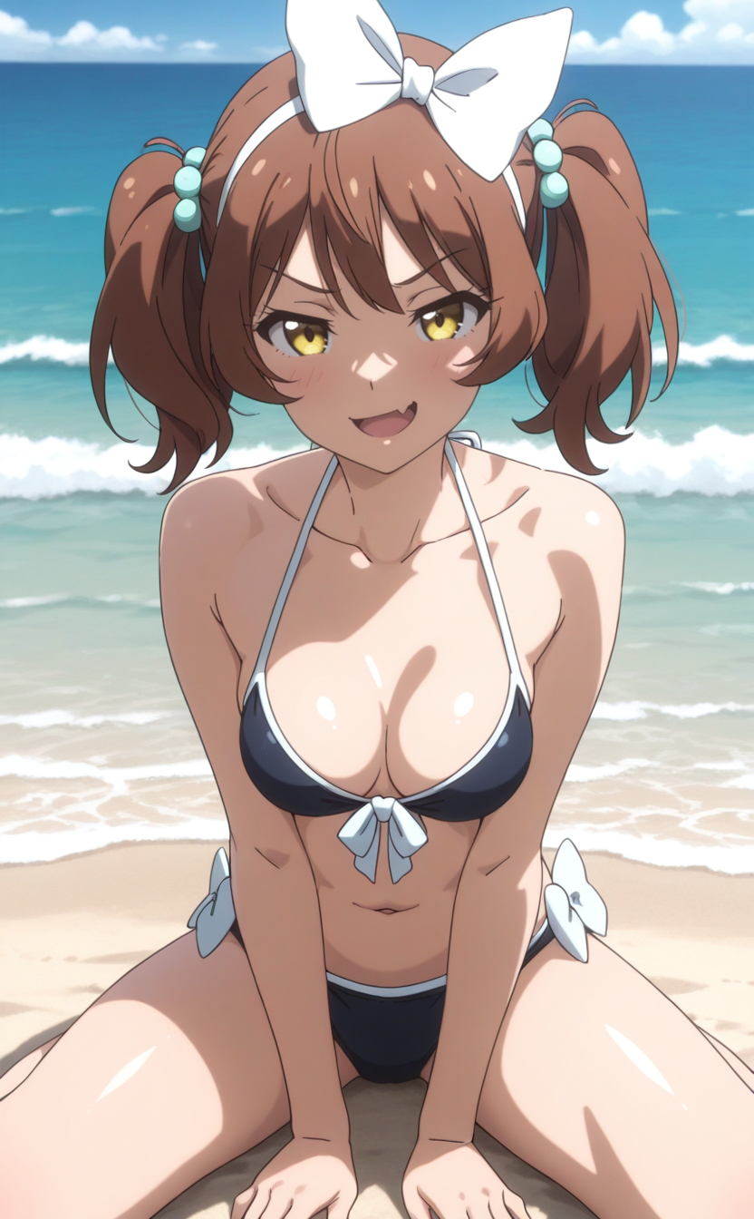 1girl,akibameidoboxser,solo,twintails,brown hair,yellow eyes,medium breasts,bikini,short hair,hair bow,white bow,best quality,masterpiece,sensitive,,lora:AkibaMaidPuremilkeymasamiNoobai075:0.9