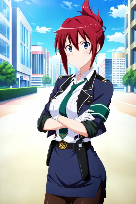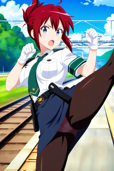 sakurai aoi, 1girl, solo, red hair, folded ponytail, blue eyes, medium breasts, police uniform, white shirt, collared shirt, short sleeves, green necktie, armband, green armband, blue skirt, pencil skirt, black belt, white gloves, holster, black pantyhose