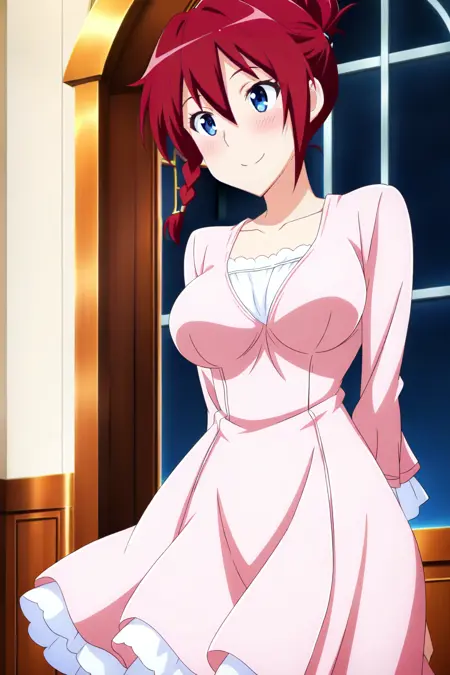 1girl, solo, red hair, folded ponytail, blue eyes, medium breasts, school uniform, blazer, brown jacket, white shirt, collared shirt, long sleeves, red skirt, plaid skirt, pleated skirt, blue necktie, red necktie, two-tone necktie, striped necktie, black pantyhose