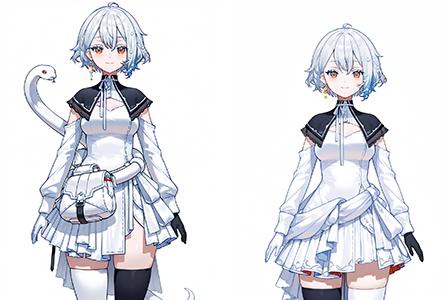 shirona shizuku, white dress, black capelet, white snake,asymmetrical gloves,standing, Single earring,
