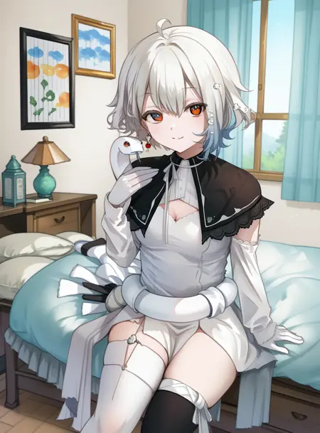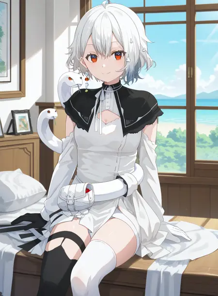 shirona shizuku, white dress, black capelet, white snake,asymmetrical gloves,standing, Single earring,