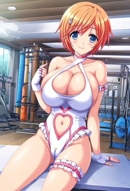 2번 옷차림: 흰색 헬터 레오타드, 분홍색 하트 모양 컷아웃, 분홍색 주름장식, 흰색 핑거리스 장갑, 흰색 다리 밴드