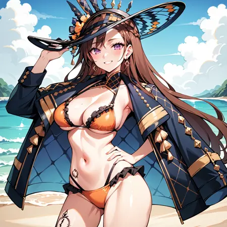 Basic Look: 1girl, solo, hat, long hair, purple eyes, earrings, jewelry, large breasts, breasts