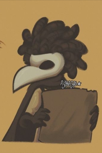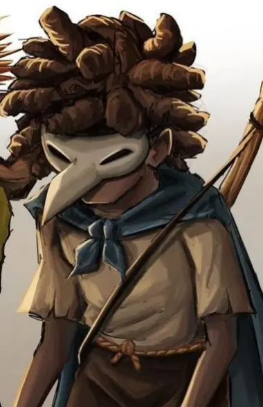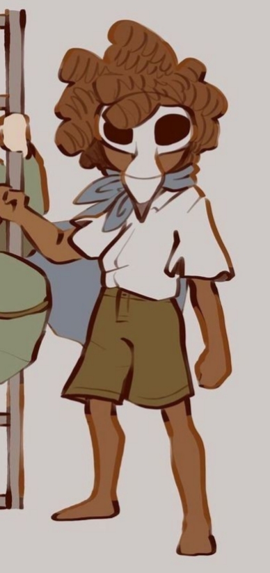 Boy wearing a white shirt,small blue cape,white raven mask,raven mask,dark brown afro styled hair with wicks,dark skin, blue and red bracelet around one ankle,Low (Little Nightmares 3)