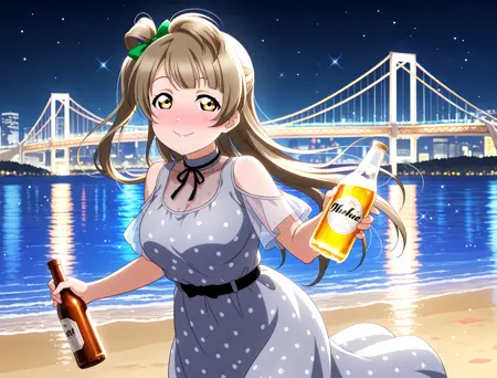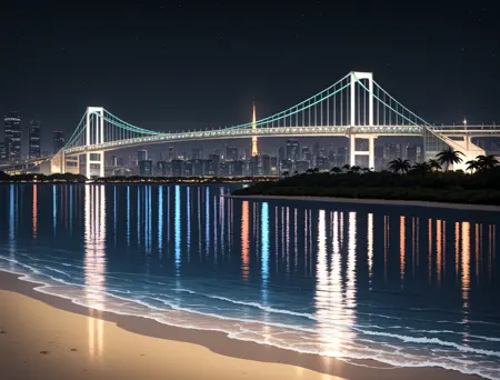 rainbowbridge, odaibakaihinkoen, beach, sand, reflective water, night, night sky, black background