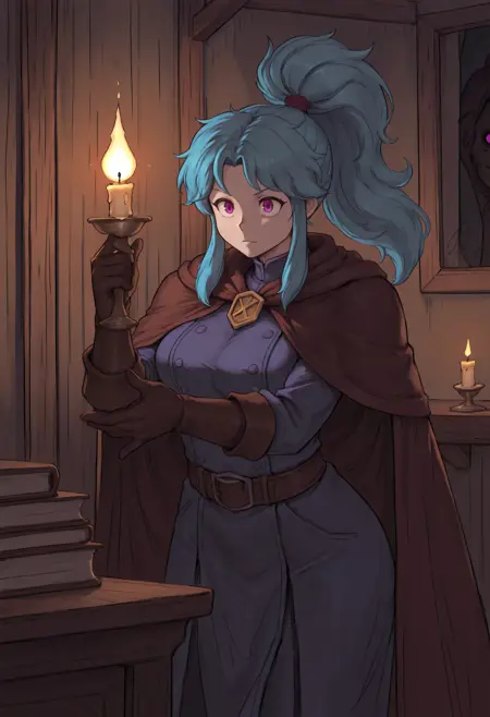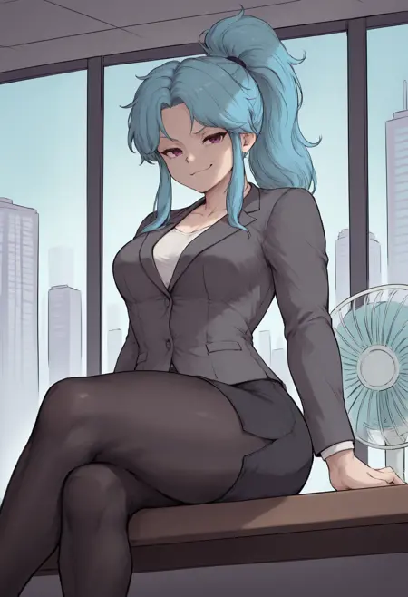 yybtn, long hair, high ponytail, sidelocks, blue hair, purple eyes,